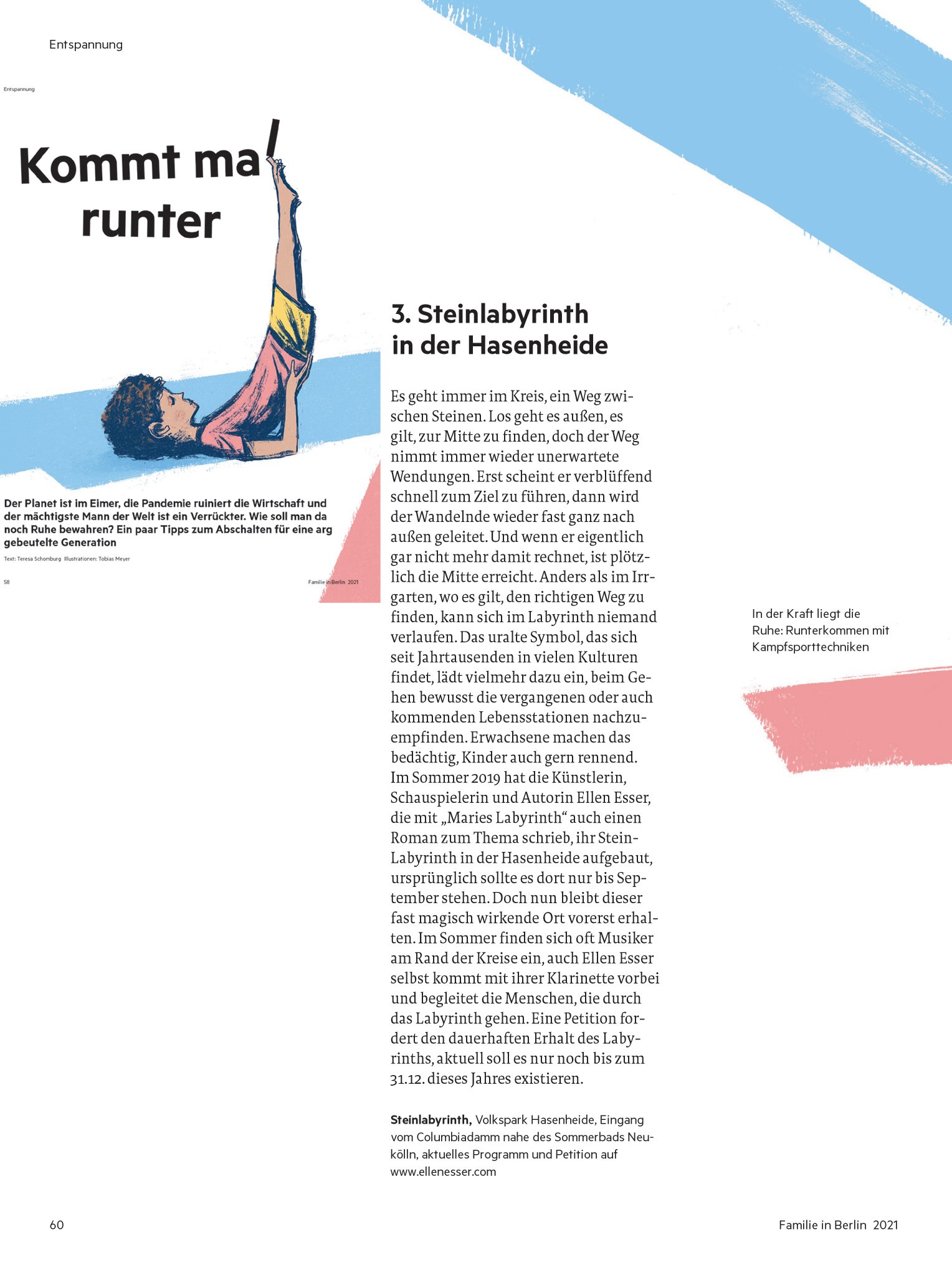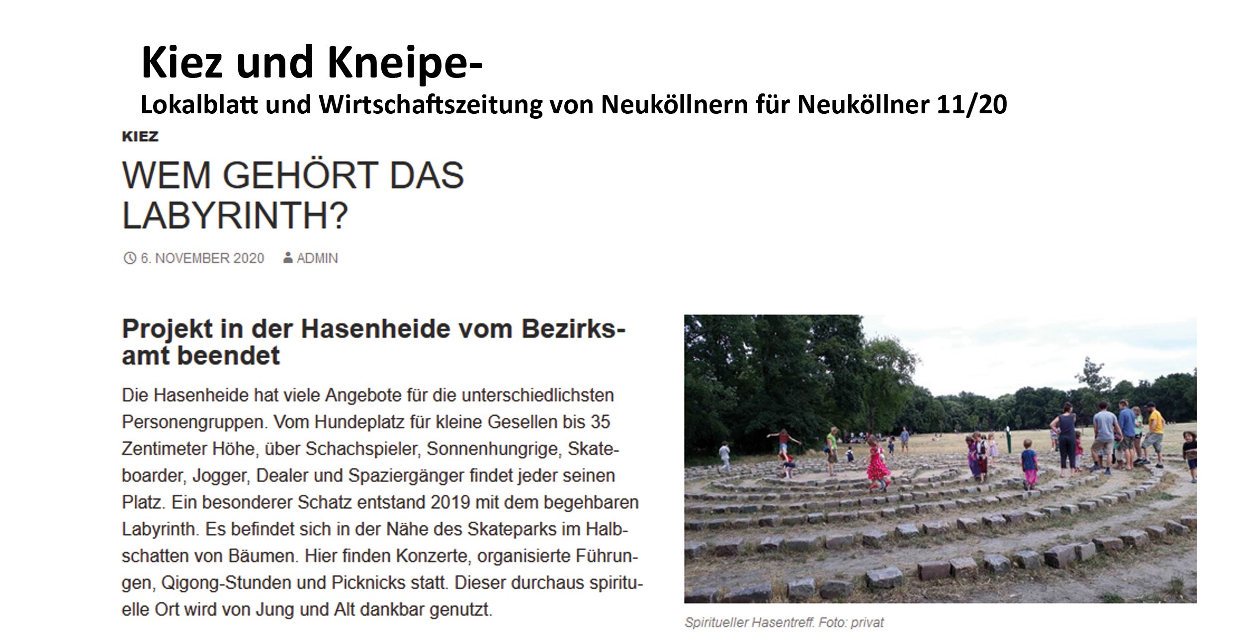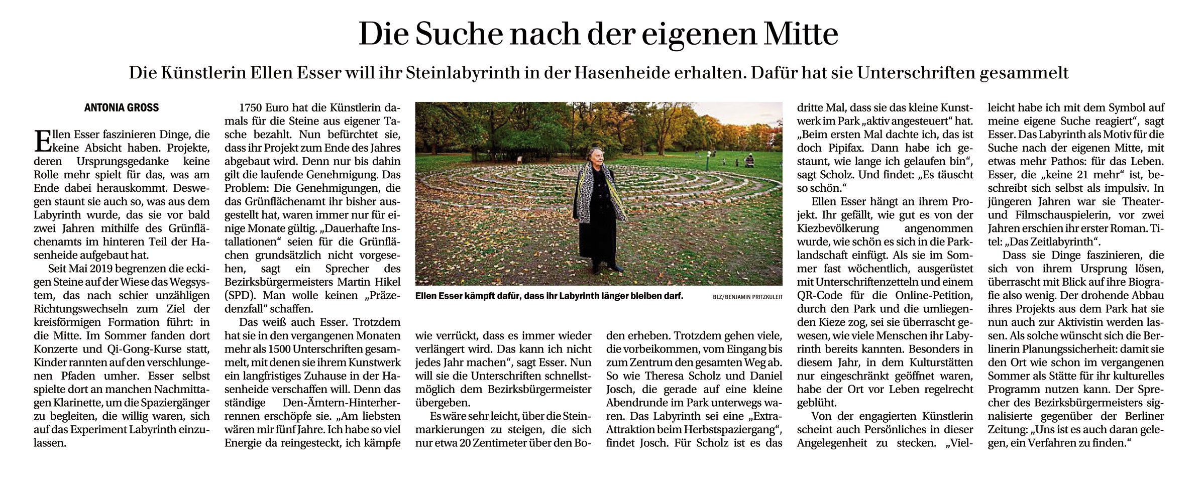 Ellen Esser hängt an ihrem Projekt. Ihr gefällt, wie gut es von der Kiezbevölkerung angenommen wurde, wie schön es sich in die Parklandschaft einfügt. Als sie im Sommer fast wöchentlich, ausgerüstet mit Unterschriftenzetteln und einem QR-Code für die Online-Petition, durch den Park und die umliegenden Kieze zog, sei sie überrascht gewesen, wie viele Menschen ihr Labyrinth bereits kannten. Besonders in diesem Jahr, in dem Kulturstätten nur eingeschränkt geöffnet waren, habe der Ort vor Leben regelrecht geblüht.